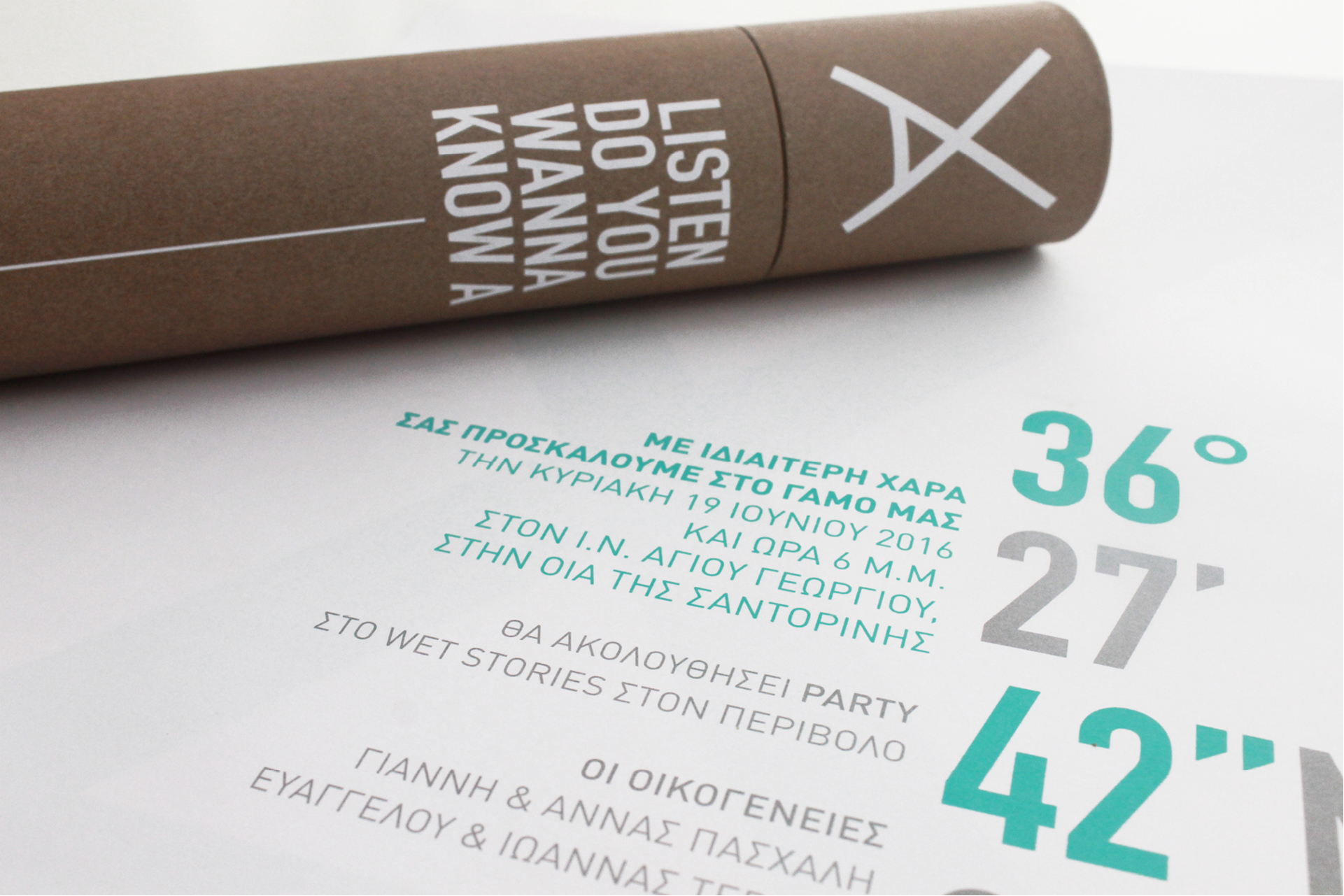 Σχεδιασμός πρόσκλησης και λογότυπου για γάμο στη Σαντορίνη. Το εικαστικό της πρόσκλησης -και όλα τα εικαστικά του γάμου- βασίστηκε στις συντεταγμένες του νησιού 36° 27’ 42’’ N 25° 22’ 31’’ Ε και στο όνομα του, Σαντορίνη. Η πρόσκληση μπήκε σε χάρτινο tube με teaser “Listen do you wanna know a secret” δεδομένου ότι ο γάμος κρατήθηκε σε στενό οικογενειακό και φιλικό κύκλο για να παραδοθεί στους παραλήπτες.
